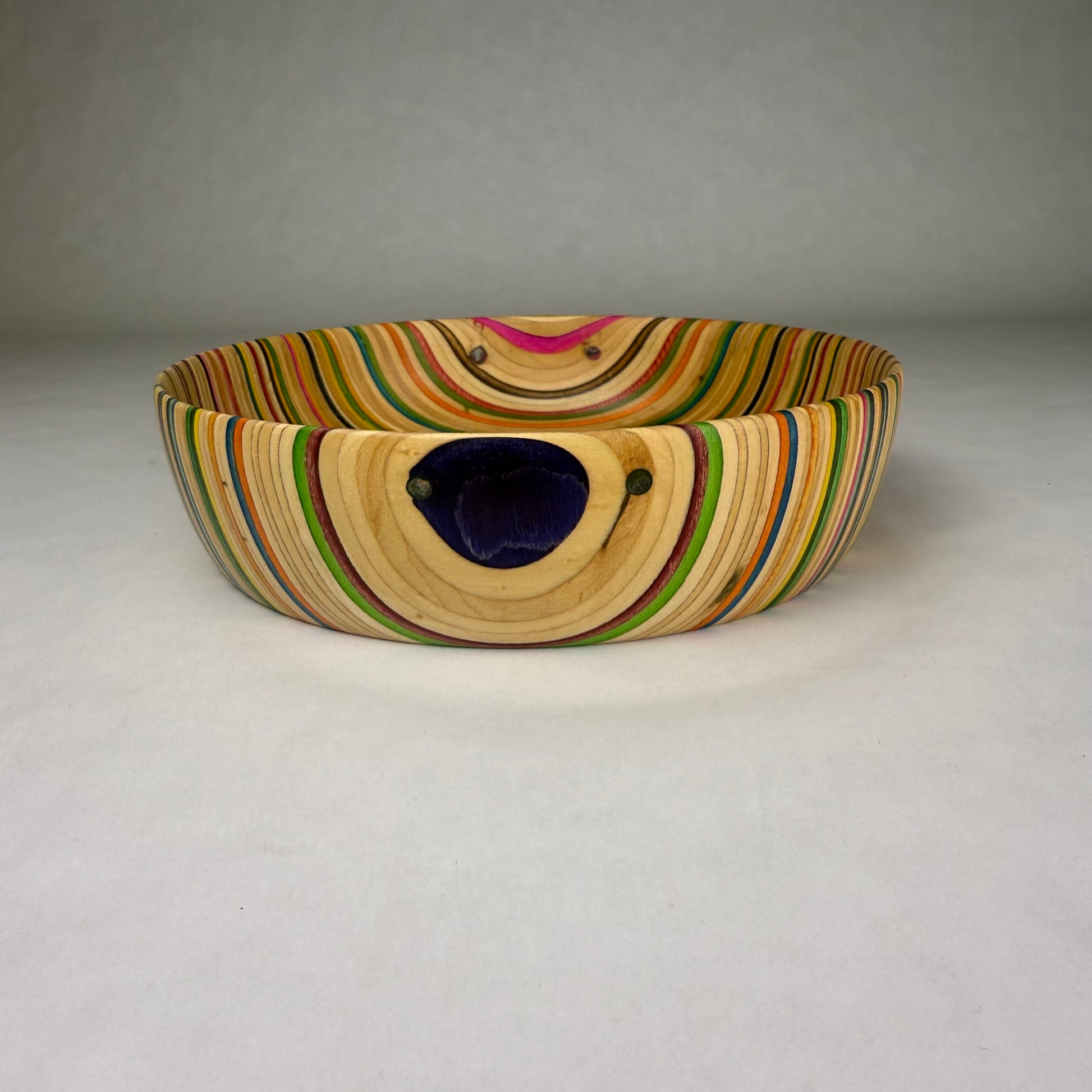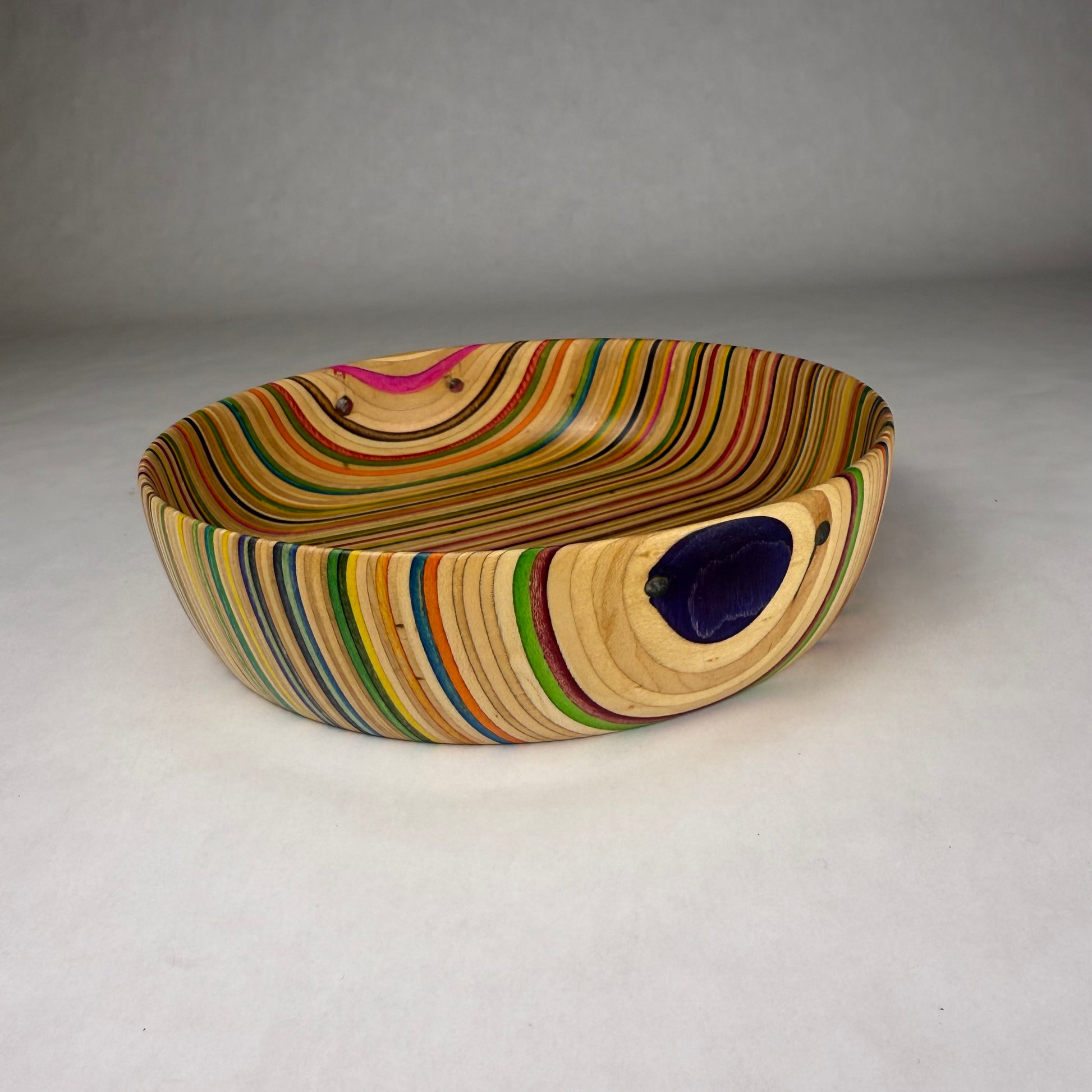 One of a kind bowls that consists of multiple repurposed skateboard noses and tails, laminated together and turned on the lathe. A colorful and unique addition to your home decor!