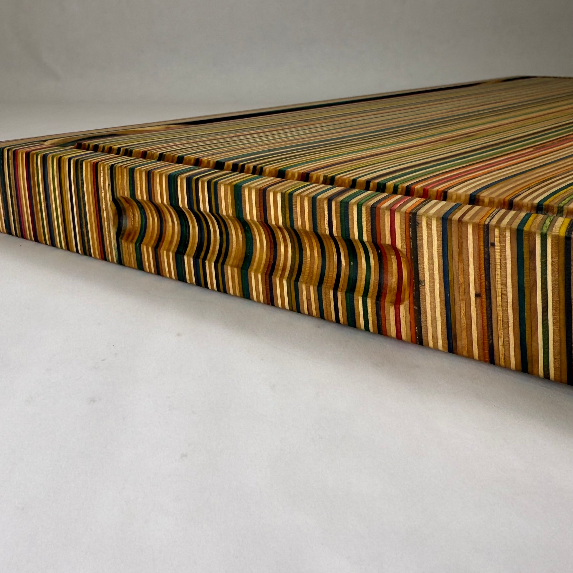 Handmade in Mooresville, NC, This premium hardwood cutting and charcuterie boards are crafted from 25 recycled skateboards, turning broken decks into a functional piece of art. It offers a generous surface area that’s perfect for everything from prepping family meals to serving as a statement charcuterie board. Designed with deep juice grooves around the perimeter to catch excess liquids and integrated finger holds for easy lifting. Sanded and polished to 400 grit, the surface is ultra-smooth yet durable for daily use. Finished with a custom blend of food-grade mineral oil and beeswax, this board is food-safe, easy to maintain, and built to last for years in your kitchen.